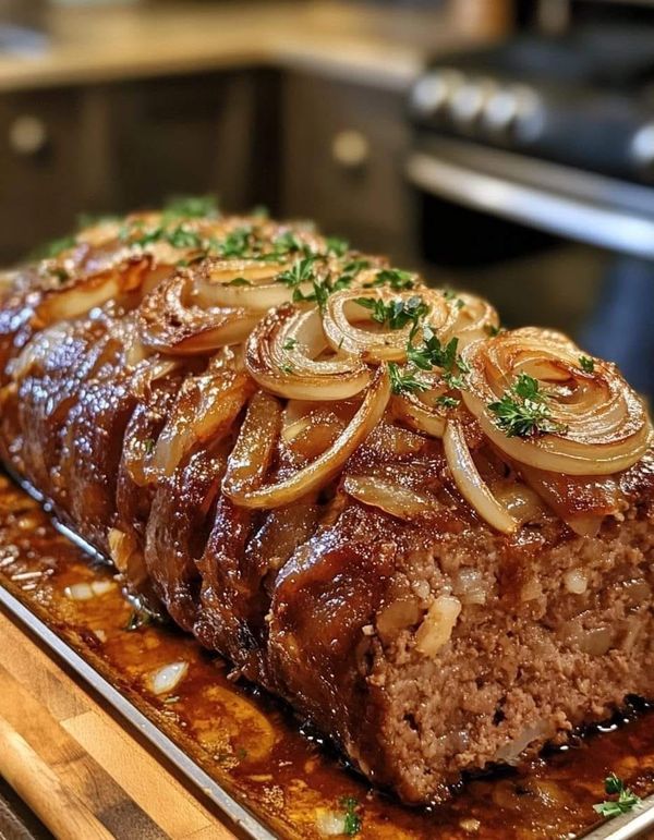 Slice the meatloaf and generously spoon the rich onion gravy over the top. Garnish with fresh parsley and serve warm.
